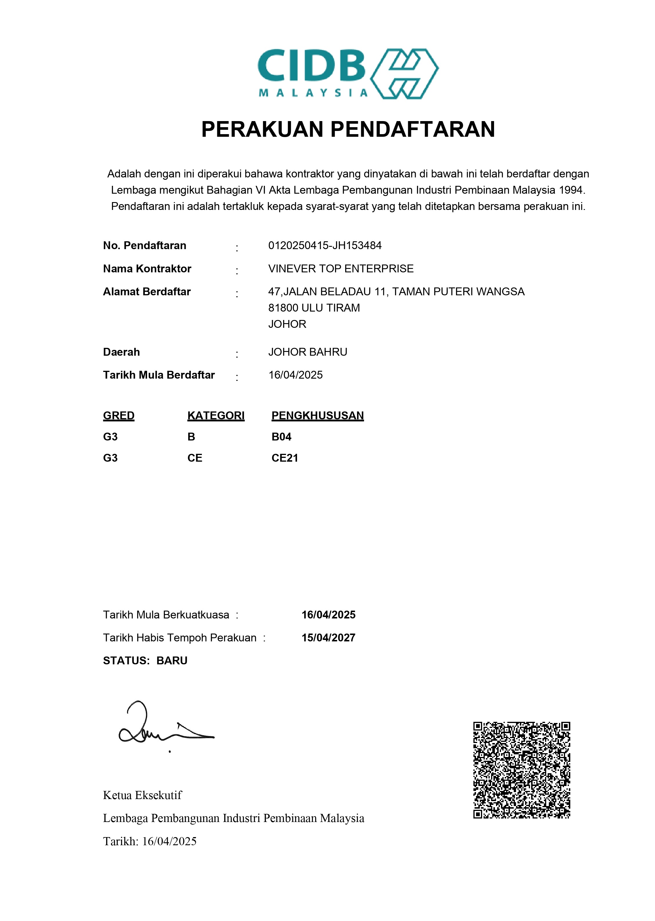 We have obtained the certification from CIDB on 2025 and has engaged in construction industry within Malaysia ever since, including various construction projects.